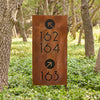 This address plaque is made to order in Austin, TX and is constructed of 14 gauge steel. This plaque features a 3/4" square tubing frame around the back to give the appearance of extra thickness and (2) metal stakes (in the same finish as the sign) that easily slide into two holes located on the back of the plaque.